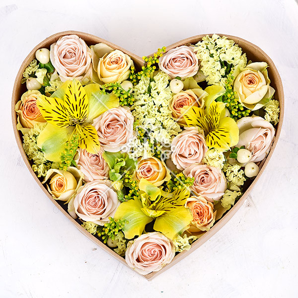 роза кремовая кустовая – 2 шт., роза желтая кустовая – 2 шт., альстромерия желтая - 1 шт., гиперикум белый – 1 шт., статица жёлтая – 1 шт., зелень декоративная (солидаго), оазис, коробка.
